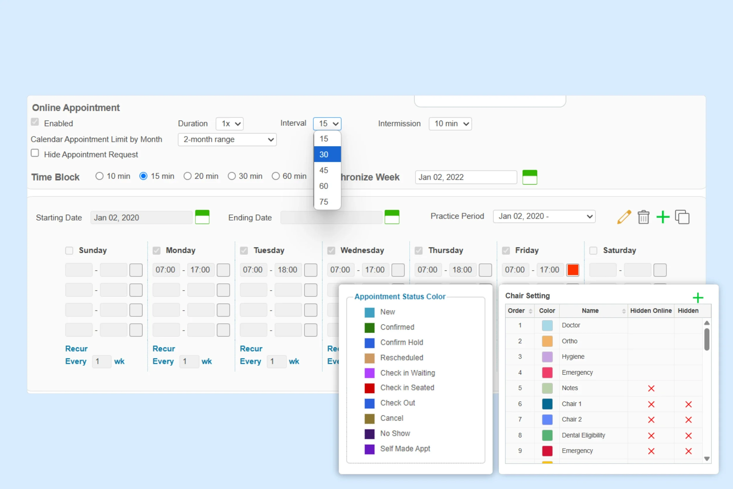 The dental scheduling software provides a recurrence feature with start-day synchronization; by default, the starting day is the nearest previous Sunday to keep weekly patterns aligned across the dental office calendar.