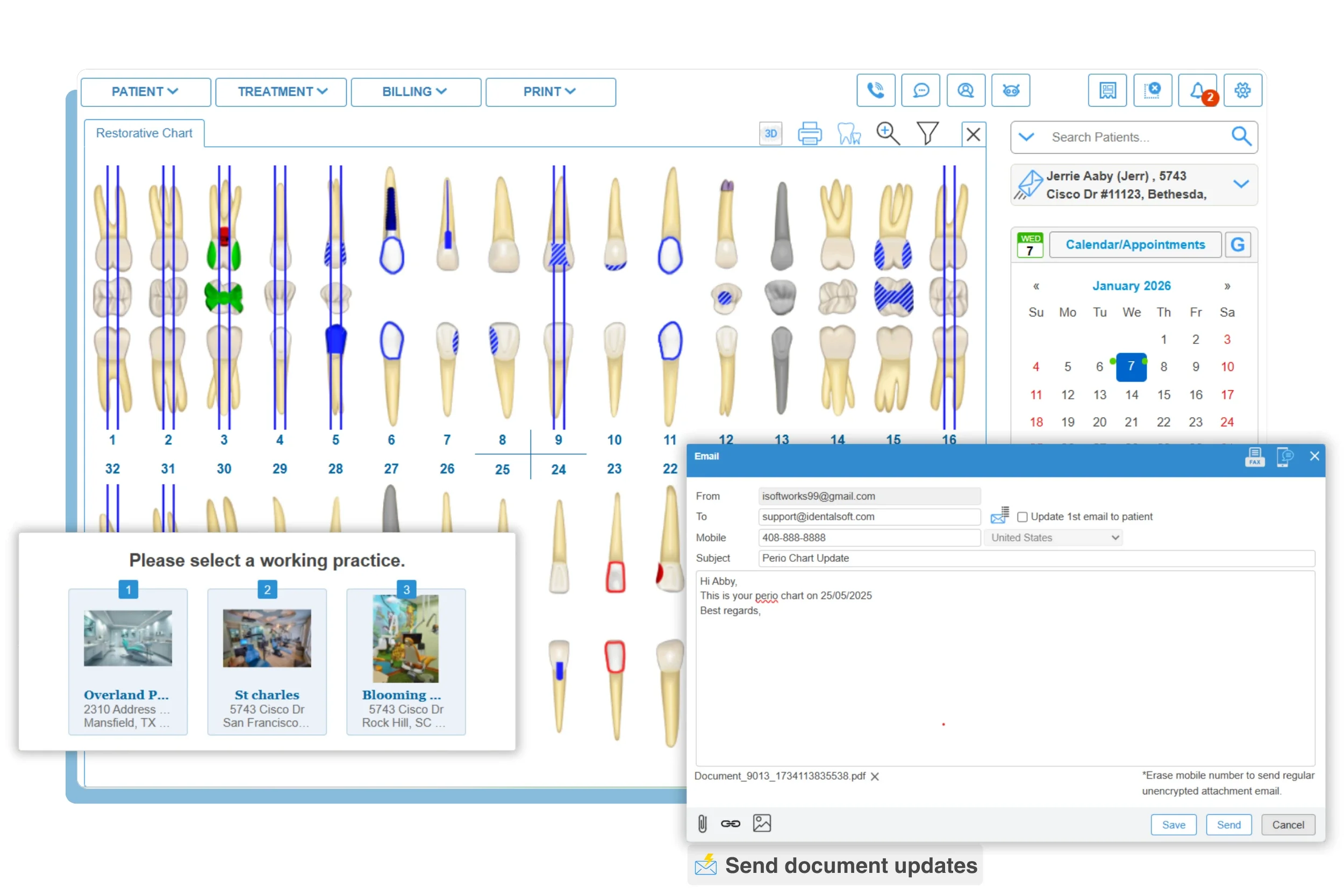 Access patient charts from any device so providers and staff can stay aligned across locations. iDentalSoft stores charts in a HIPAA-compliant cloud environment with role-based access controls and encrypted backups.