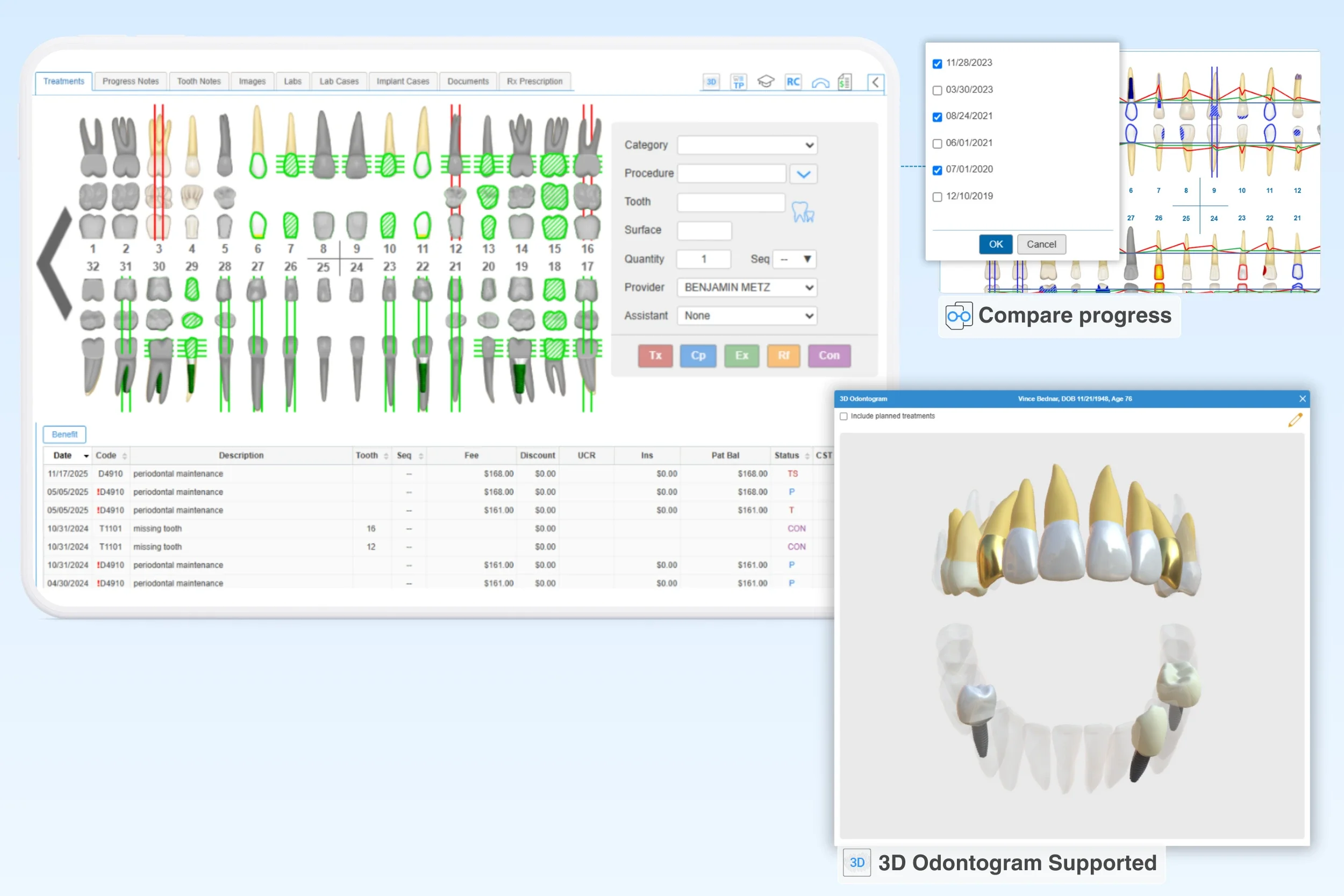 Periodontal (Perio) chart: Record perio parameters and compare charts over time for the same patient.