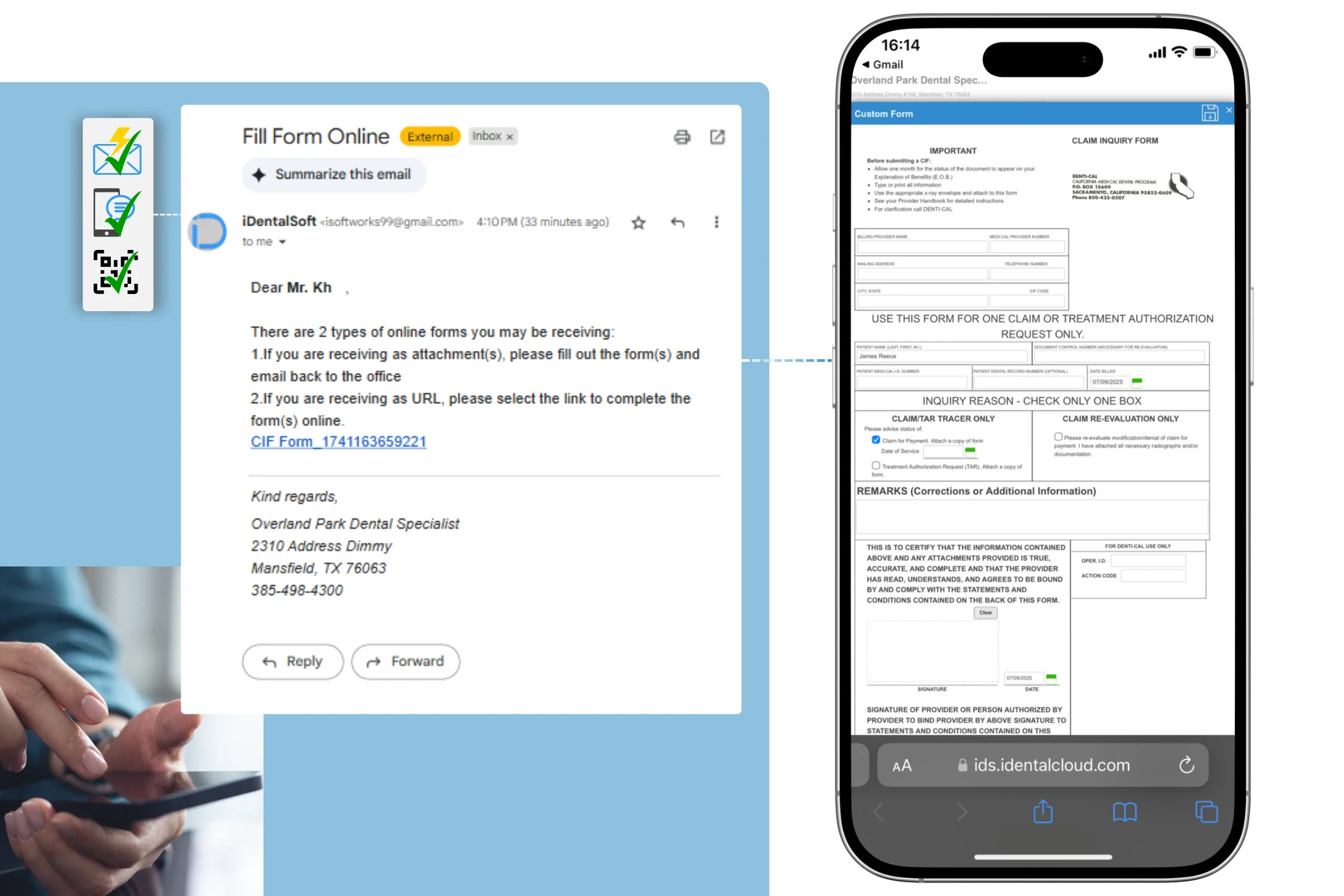 iDentalSoft's intuitive interface makes it easy for patients to complete dental forms securely from their phone or desktop—no app downloads or in-office paperwork required.