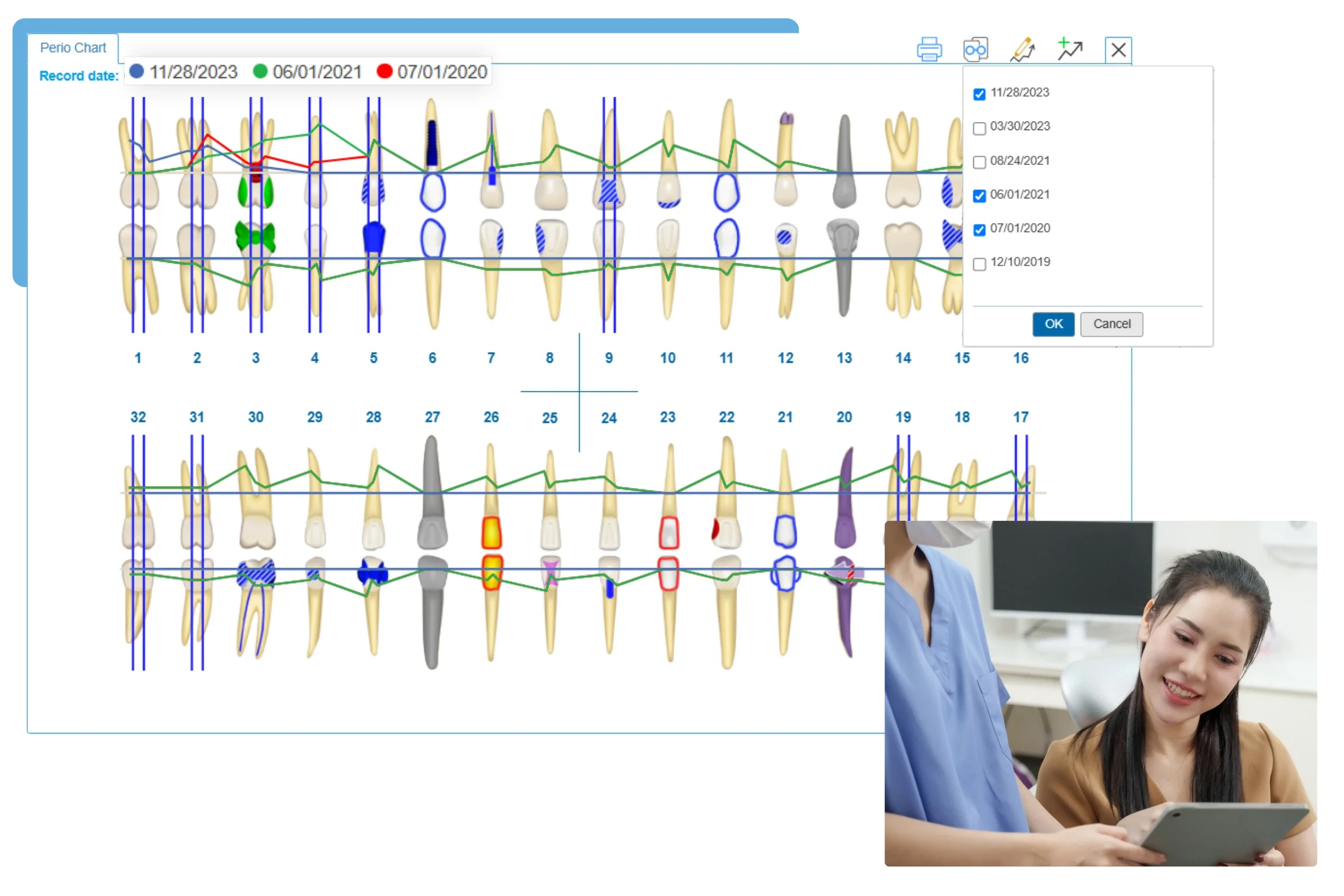 iDentalSoft allows you to review up to four past charts side by side with color-coded trend tracking. Visual progression makes it easy to spot changes over time, monitor patient improvement, and support evidence-based periodontal care.