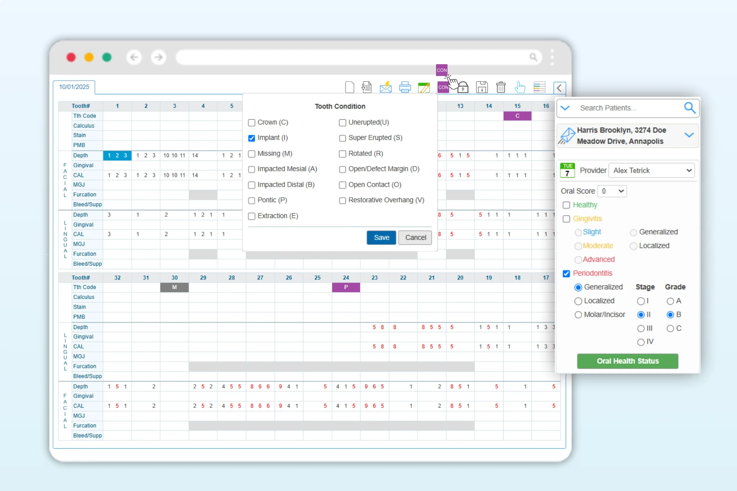 Quickly indicate each patient’s overall periodontal health status, including health classification, stage, and grade, directly within the Perio Chart. The summary appears alongside detailed measurements, making chart reviews faster and patient communication clearer.