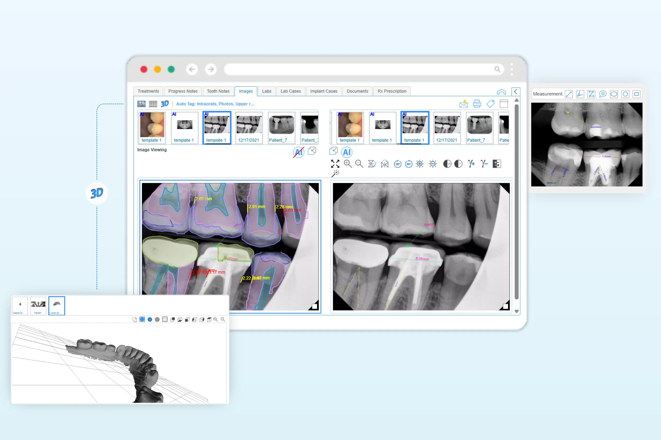 Our imaging features let you upload CBCT files and view them in the built-in DICOM viewer (zoom, rotate, measure) and add annotations, no third-party software required.