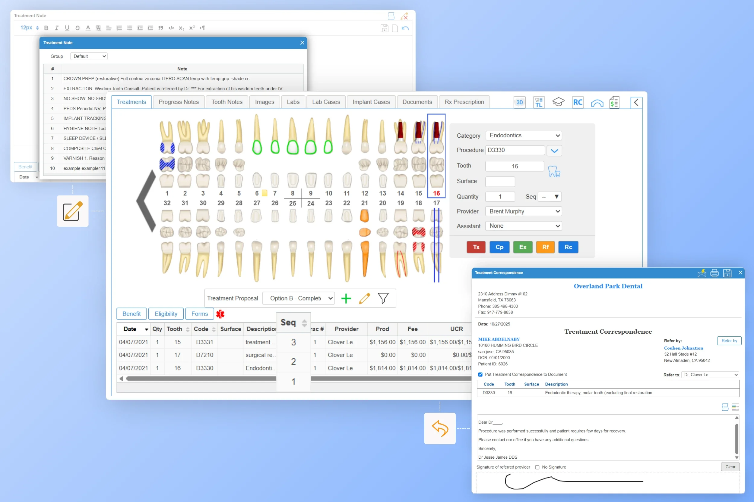 iDentalSoft also supports a smooth referral workflow. Share treatment progress with referring dentists in one click—the system automatically pulls the patient and procedure details into the correspondence letter.