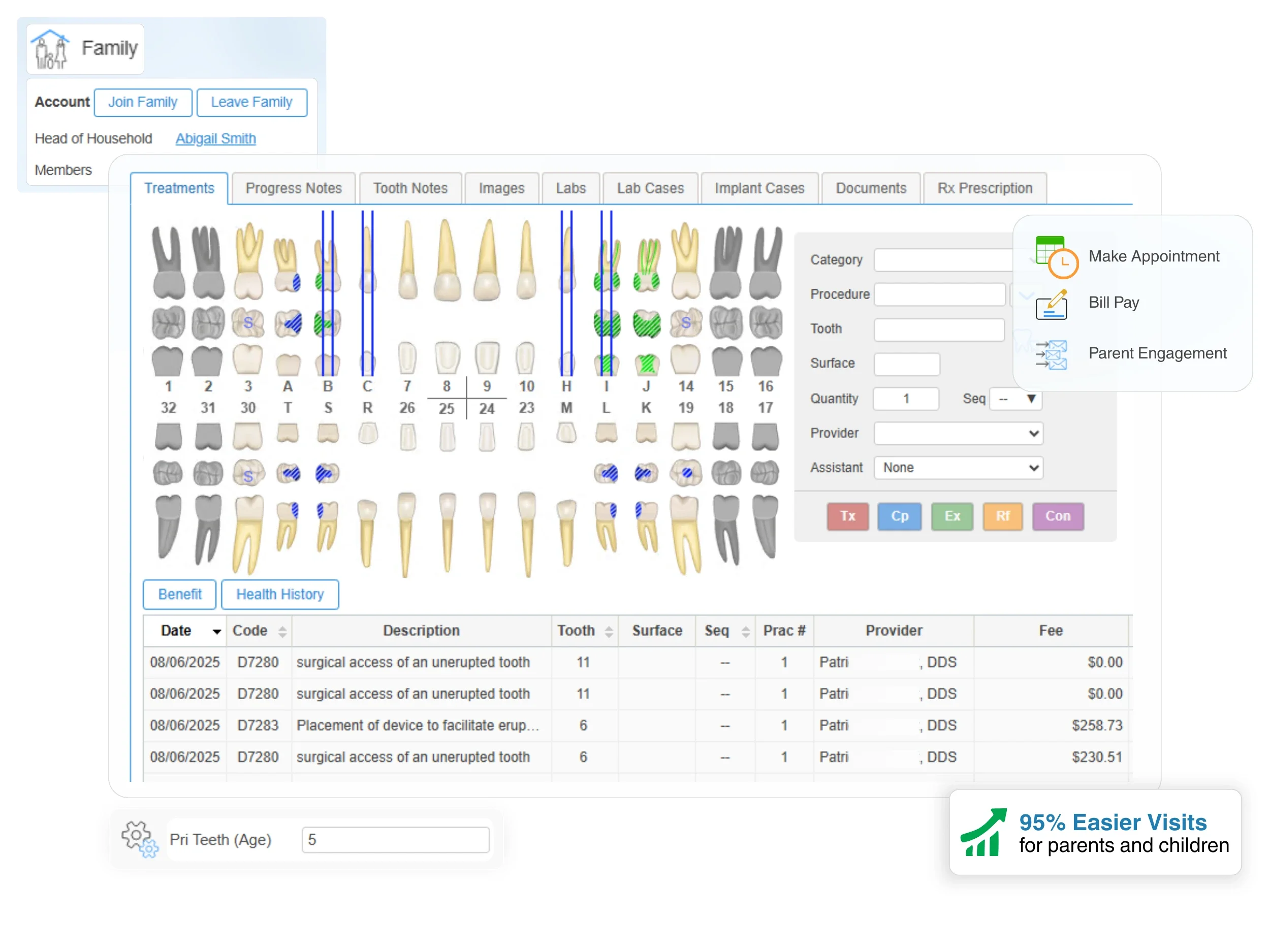 Easily capture pediatric-specific details like sealants, eruption stages, and retained teeth with built-in custom notations.